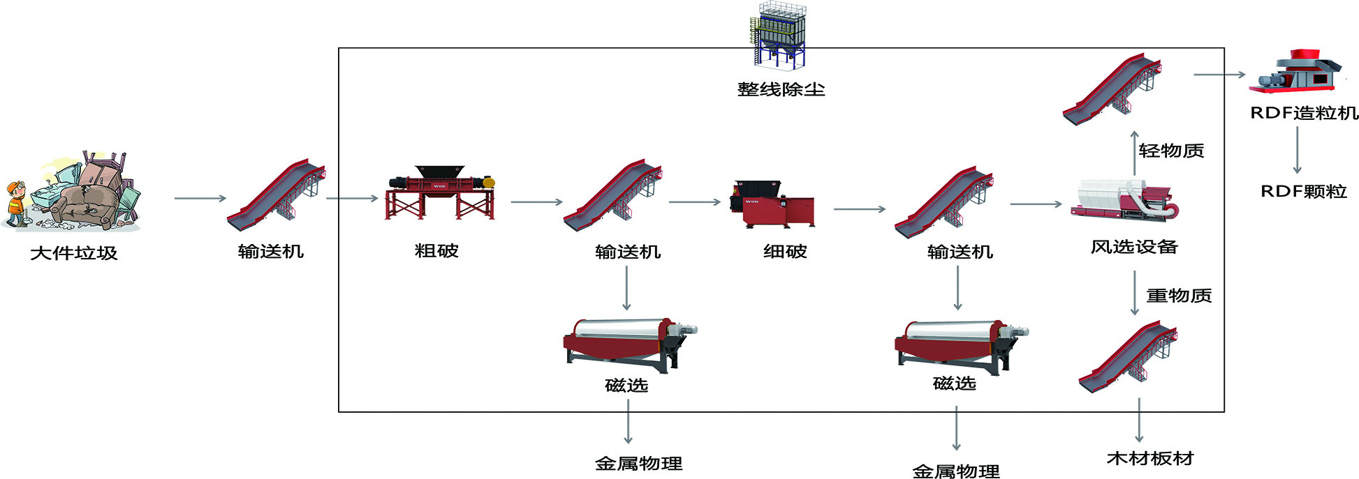 大件垃圾產(chǎn)生單位和個人將大件垃圾投入至指定堆放場所。大件垃圾投放管理責(zé)任人應(yīng)當(dāng)將其管理范圍內(nèi)產(chǎn)生的大件垃圾,交由符合規(guī)定的市容環(huán)境衛(wèi)生作業(yè)服務(wù)單位進(jìn)行清運,集中規(guī)范遠(yuǎn)輸至大件垃圾中轉(zhuǎn)分棟場,通過人工分棟,機器破碎,遠(yuǎn)輸至焚廣焚發(fā)電,資源利用。本方案針對由市容環(huán)境衛(wèi)生作業(yè)服務(wù)單位收集至大件垃圾處理場的大件垃圾通過的設(shè)備進(jìn)行拆解,對可循環(huán)利用的部分進(jìn)行收再利用,對重金屬和有毒物質(zhì)等進(jìn)行無害化處理,美化市容環(huán)境,同時做到資源再生。